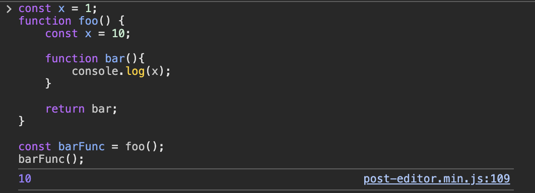 하단의 전역코드는 foo()함수를 통해 bar함수를 반환받고, 이를 변수에 저장시켜, barFunc()으로 함수실행을 진행한다.